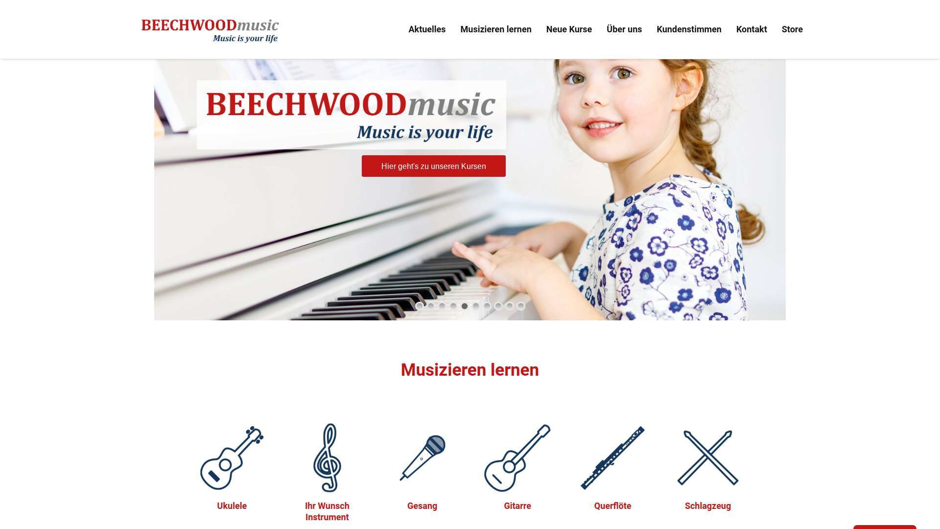 Für BEECHWOODmusic habe ich eine moderne Website gestaltet, die Musikschule und Online-Shop harmonisch vereint. Der Fokus lag auf einer klaren Struktur, ansprechender Bildsprache und einer benutzerfreundlichen Navigation – perfekt abgestimmt auf die Zielgruppe von Kindern bis Erwachsenen.